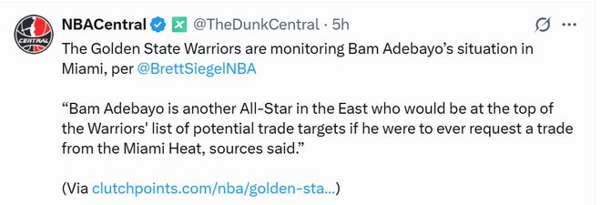 NBACentral写道:消息人士透露,勇士正在关注阿德巴约在迈阿密的情况。“消息人士称,阿德巴约如果向迈阿密热火队提出交易请求,他将位列勇士队潜在交易目标名单的首位。”